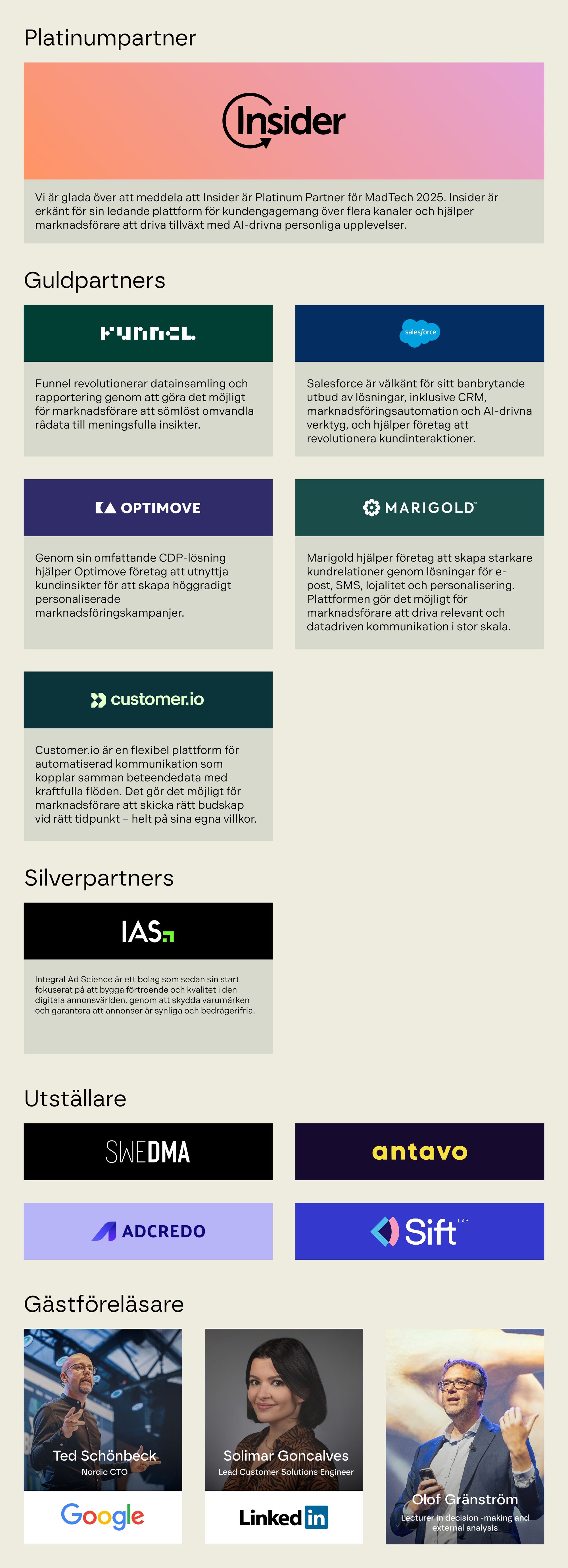 MadTech är tillbaka – 2025 års upplaga samlar återigen branschens vassaste aktörer inom Martech, Adtech och Data för en fullspäckad dag med insikter, idéer och ny teknik. Tillsammans med våra partners bjuder vi på inspirerande sessioner där du får lära dig hur data och analys kan driva smartare beslut och omvandlas till konkreta strategier med riktig affärspåverkan.